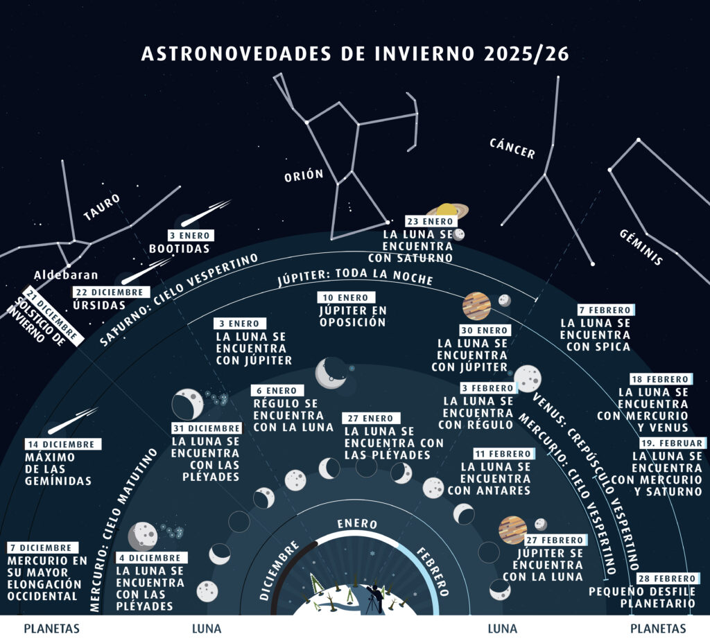 Ha llegado el momento: empieza el invierno, y a las 16:00 el Sol se encuentra tan bajo como nunca en todo el año. El día se despide temprano y la noche se extiende durante el resto de las horas. Para muchos aficionados a la astronomía, esta es la mejor época: las largas noches invitan a sacar el telescopio tras la jornada laboral. Desde ahora la luz vuelve poco a poco, casi imperceptible, pero cada día un poco más.