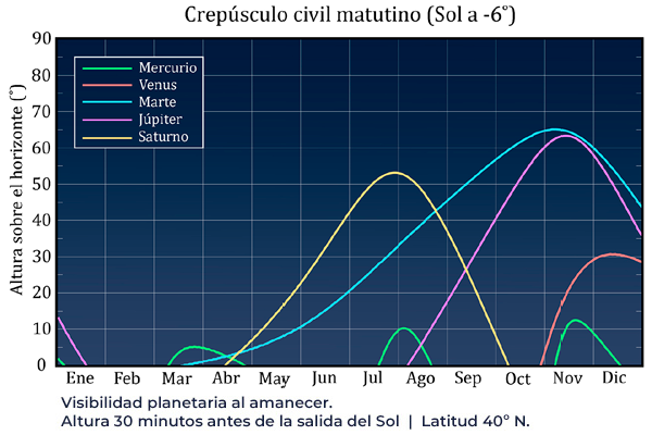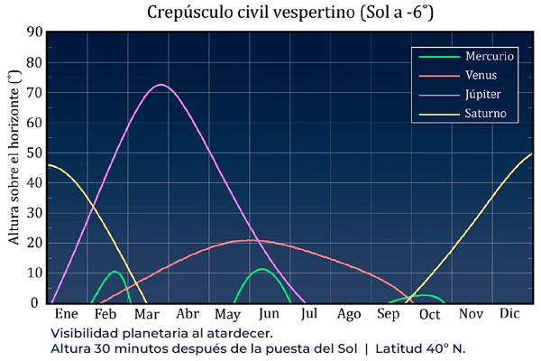 Como colofón, te espera un espectáculo poco común. Poco después de la puesta de Sol, varios planetas se alinean a lo largo de la eclíptica: Mercurio y Venus muy bajos en el oeste, un poco más arriba Saturno y, cerca aunque invisible, Neptuno. Alto en Géminis brilla Júpiter y en Tauro el discreto Urano. Como ves, solo falta Marte, al otro lado del Sol, pero el desfile no es fácil de ver: algunos planetas están bajos y desaparecen rápido en el crepúsculo. Si tienes paciencia y eliges un lugar con buena vista al horizonte oeste, puedes descubrir varios planetas con prismáticos.